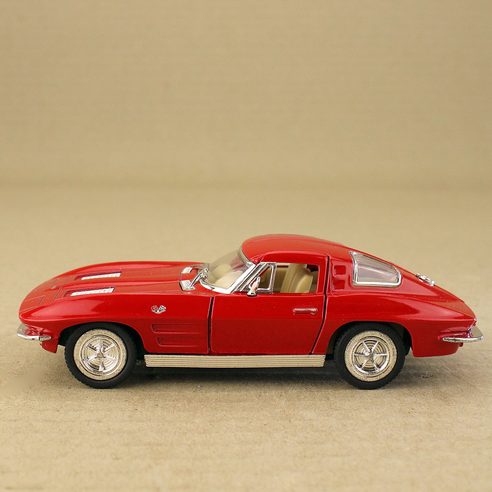 The 1963 Corvette Stingray defined an era that is still the pinnacle of cool. This fully licensed die-cast model car from Kinsmart packs impressive detail and miniature decals into its 1:36 scale. It measures 13cm long, has opening doors with a detailed plastic interior, and a pull-back action.