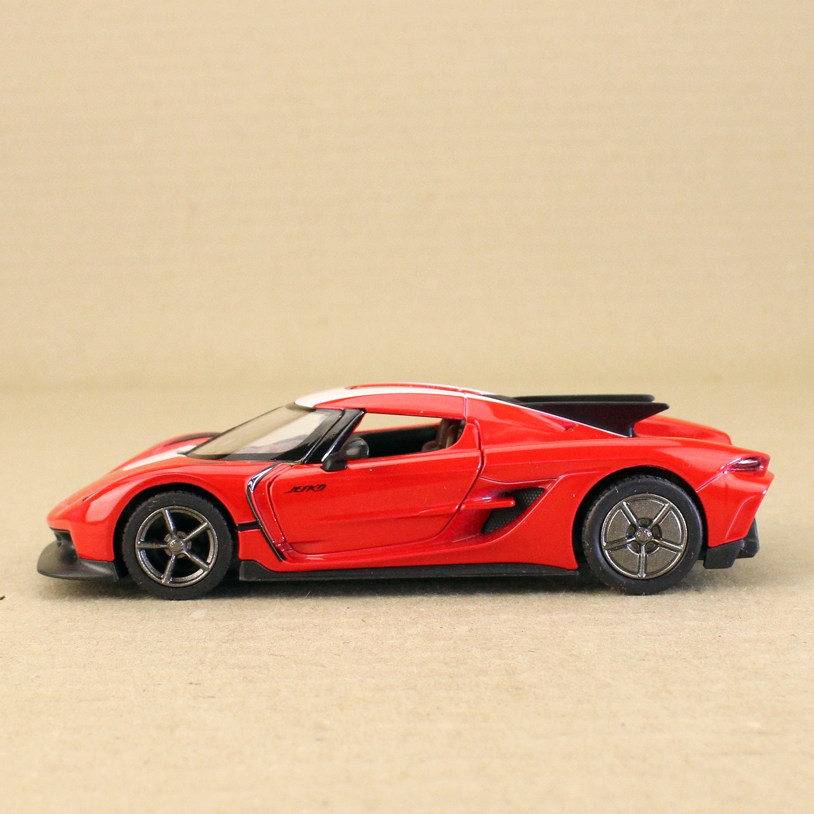 The sleek and unique Swedish hypercar - the 2019 Koenigsegg Jesko Absolut - built for speed and highly desirable. This is the striped livery edition, fully licensed Kinsmart die-cast model in 1:36 scale, about 12.5cm long, and superbly detailed inside and out with authentic insignia, opening gull-wing doors, and a pull-back action. It is fuel for dreams. Model is not boxed.