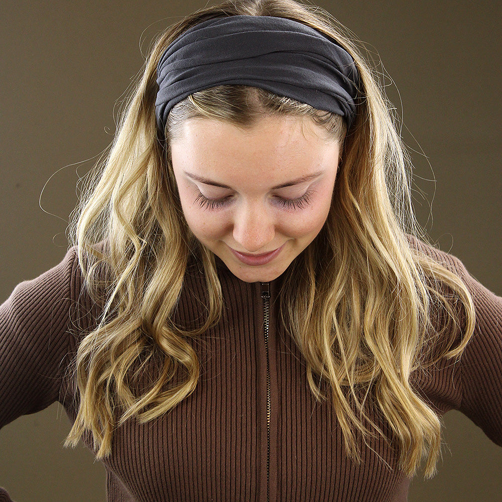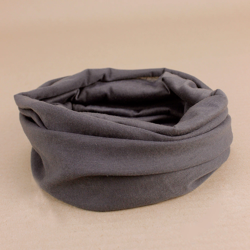 These head wraps are so versatile. A tube of cosy thin cotton, dark grey stretch fabric that can be scrunched up and worn as a headband, or kept long as a complete head covering.