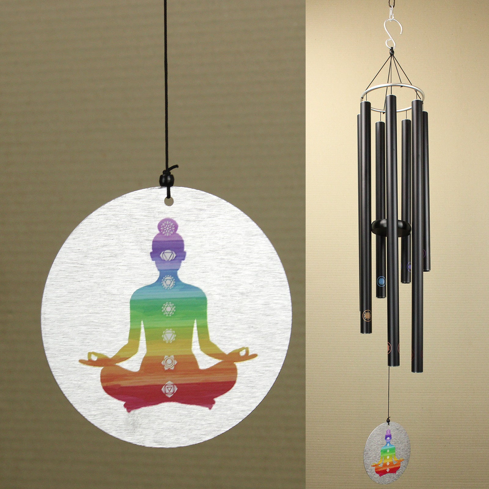 Tuned to a musical scale, deeply sonorous, meditative and melodic, this black metal wind chime has seven pipes, each representing one of the seven chakras, and decorated with its corresponding symbol. The large brushed metal sail features a vibrant representation of the main energy centres in the body. The chime has an overall length from hook to sail of 110cm. The longest pipe is 62cm. The hoop diameter is 16cm, and the sail has a diameter of 13cm.
