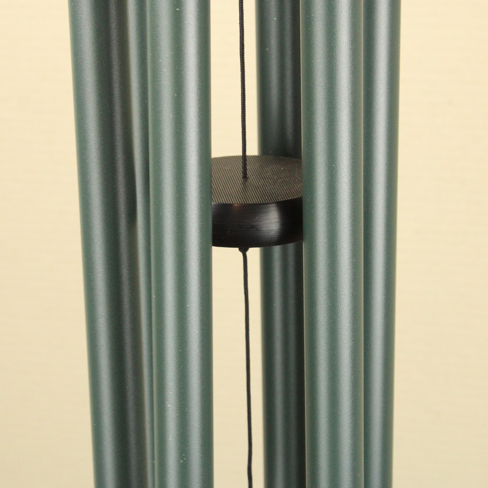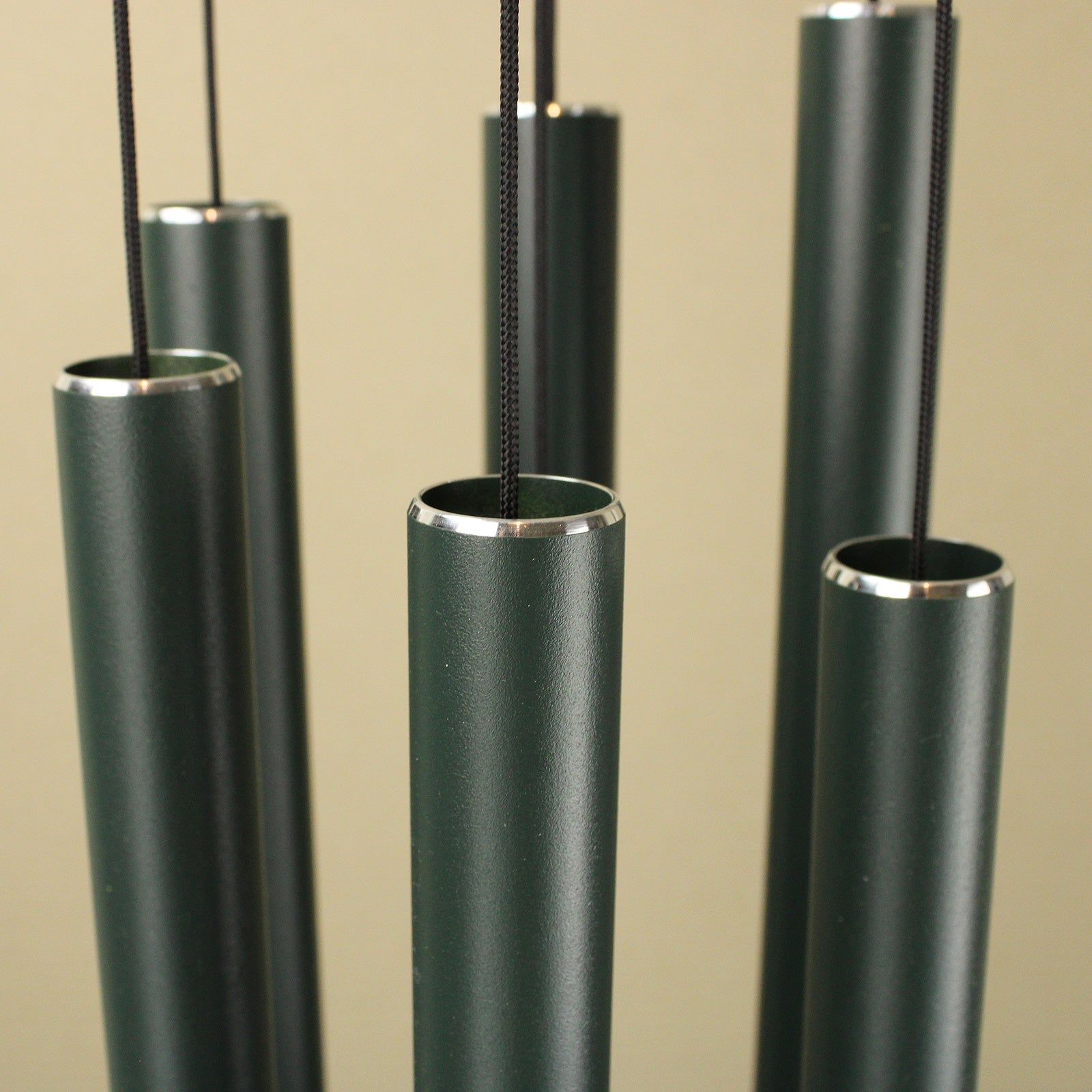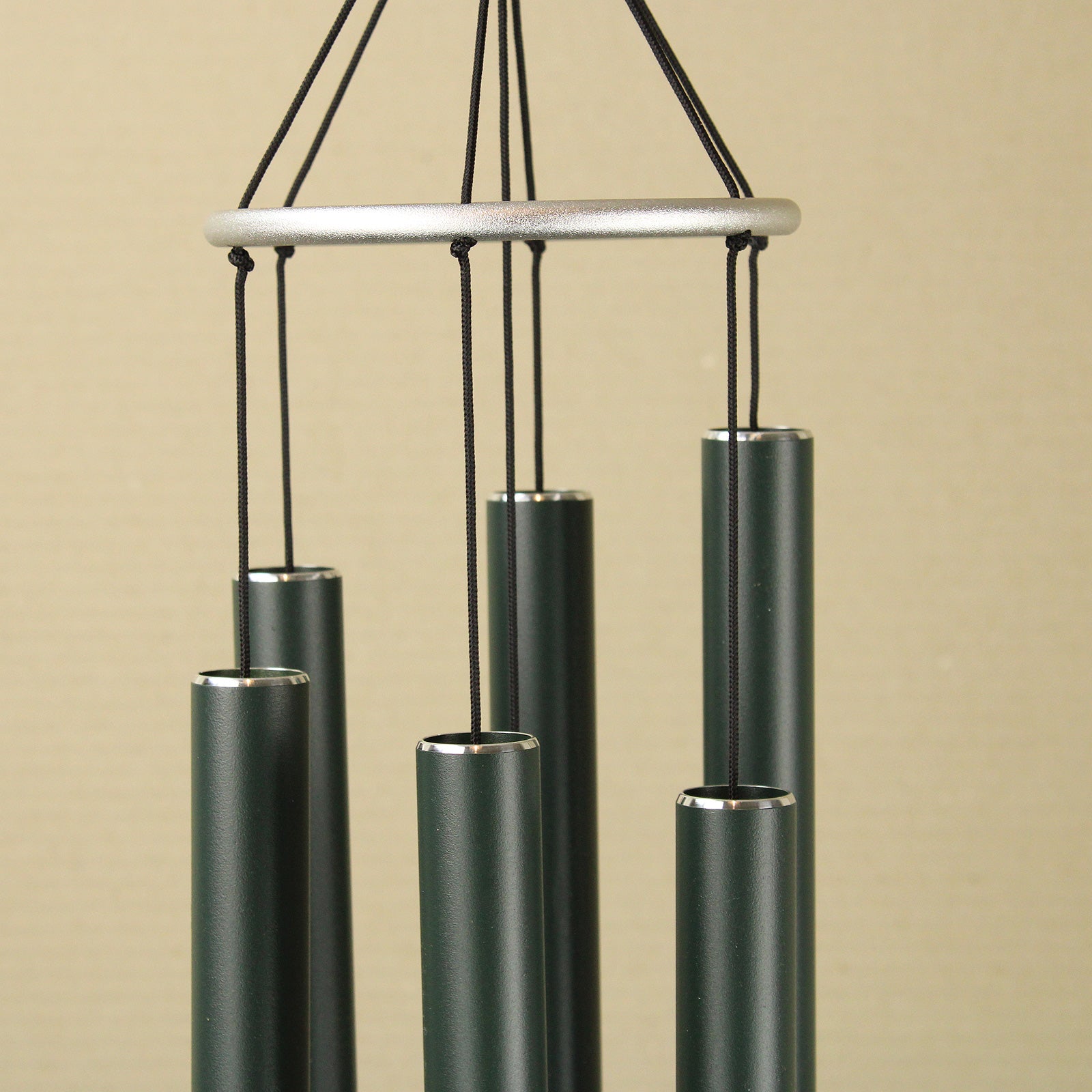 Tuned to an harmonic musical scale, with metal pipes painted forest green, this melodic wind chime will provide a soothing soundscape for your home. The brushed metal sail is printed with a musical scale. The chime has an overall length from hook to sail of 100cm. The longest pipe is 48cm. The hoop diameter is 13cm, and the sail has a diameter of 12cm.