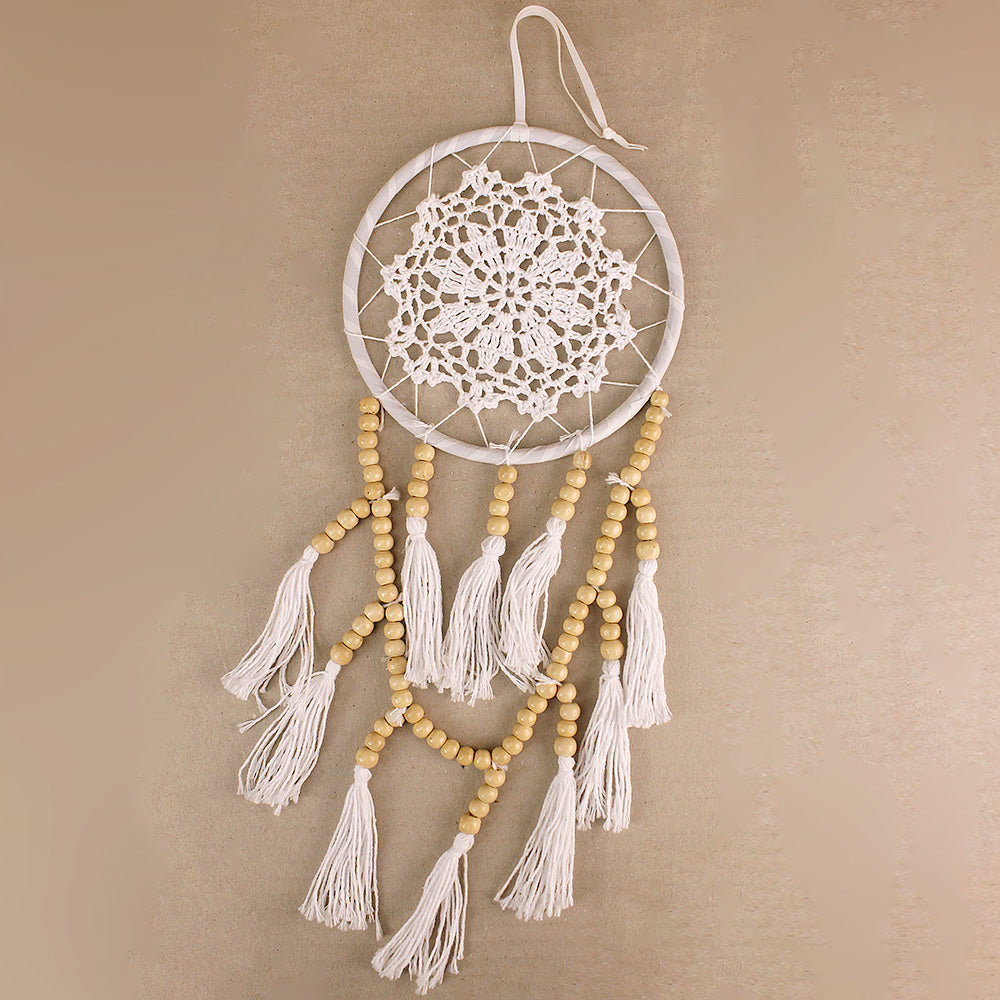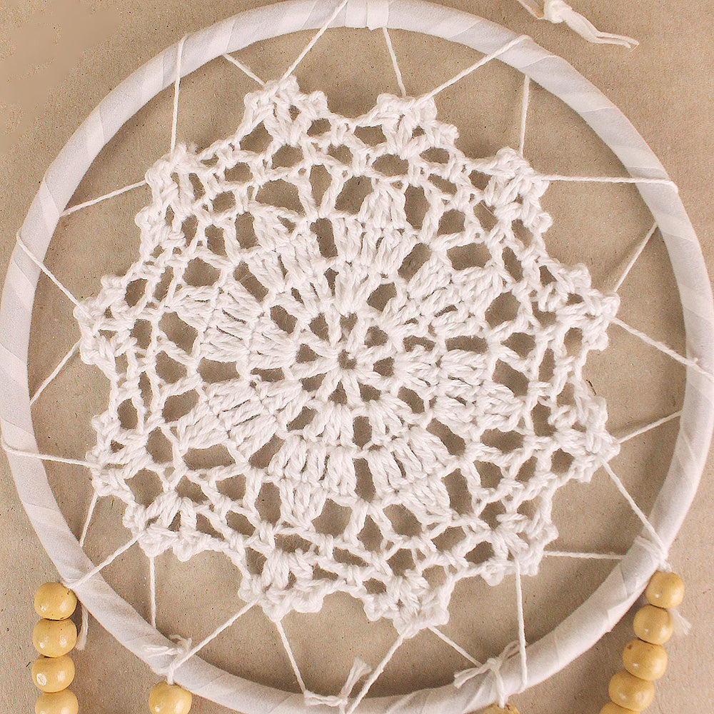 White dreamcatcher with a white crochet web inside a white ribbon hoop, with white tassels hanging from rows of natural wooden Mala beads. The hoop measures 15.5cm across. The overall length of the dreamcatcher, including the ribbon loop for hanging, is 52c.